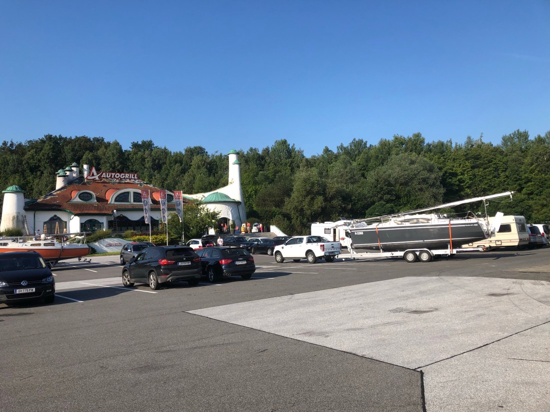 Nur noch Trailer parken, abkoppeln, Auto parken und mit dem Boot den Bootsplatz suchen!