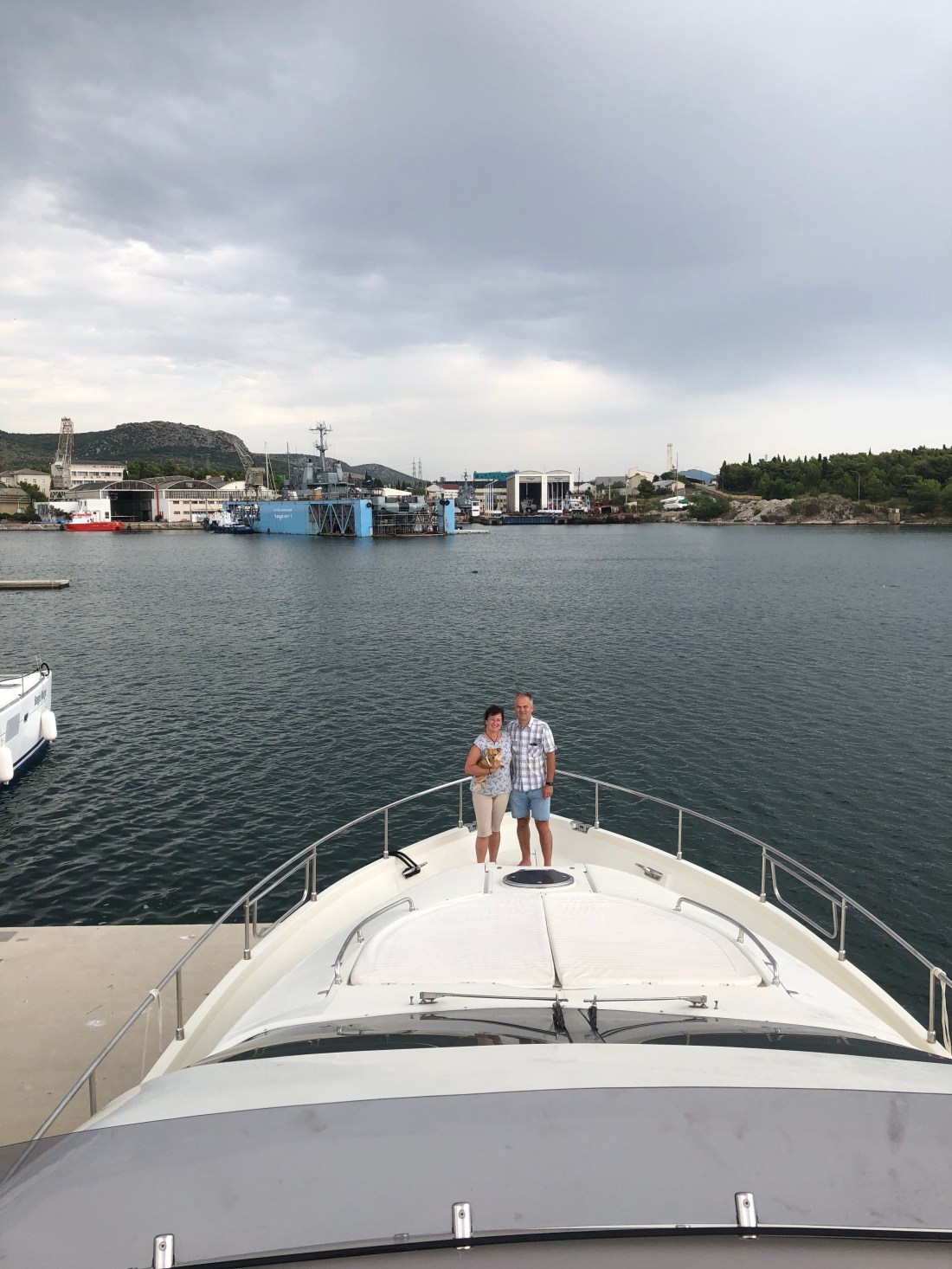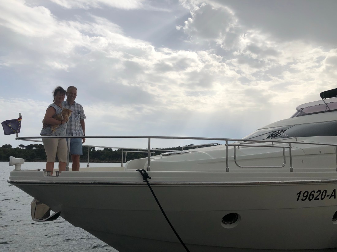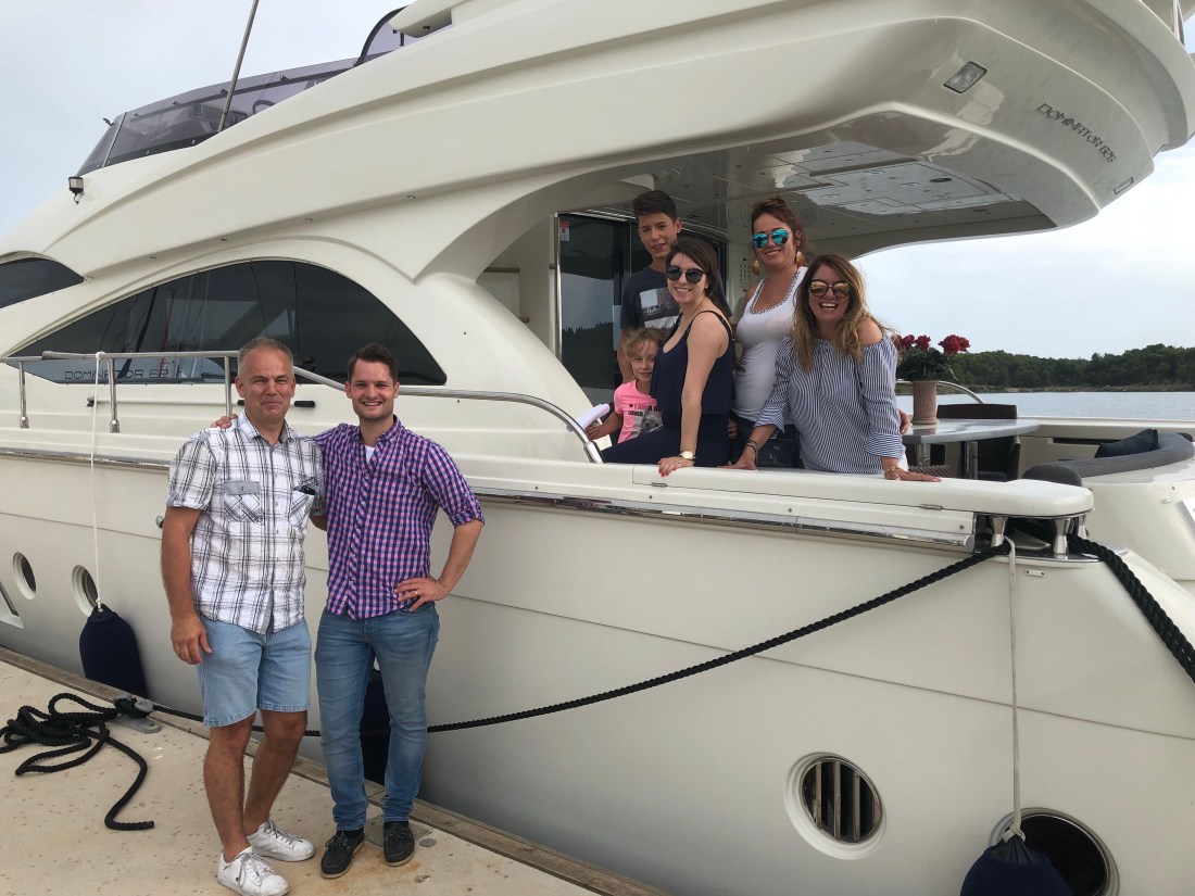 Es stellt sich heraus, dass der Treffpunkt eine Motorjacht in Sibenik mit 62 Fuß sein wird, die es aufgrund des mittlerweile schlechteren Wetters nicht nach Split geschafft hat. Dort werden wir mit Prosecco emfangen.