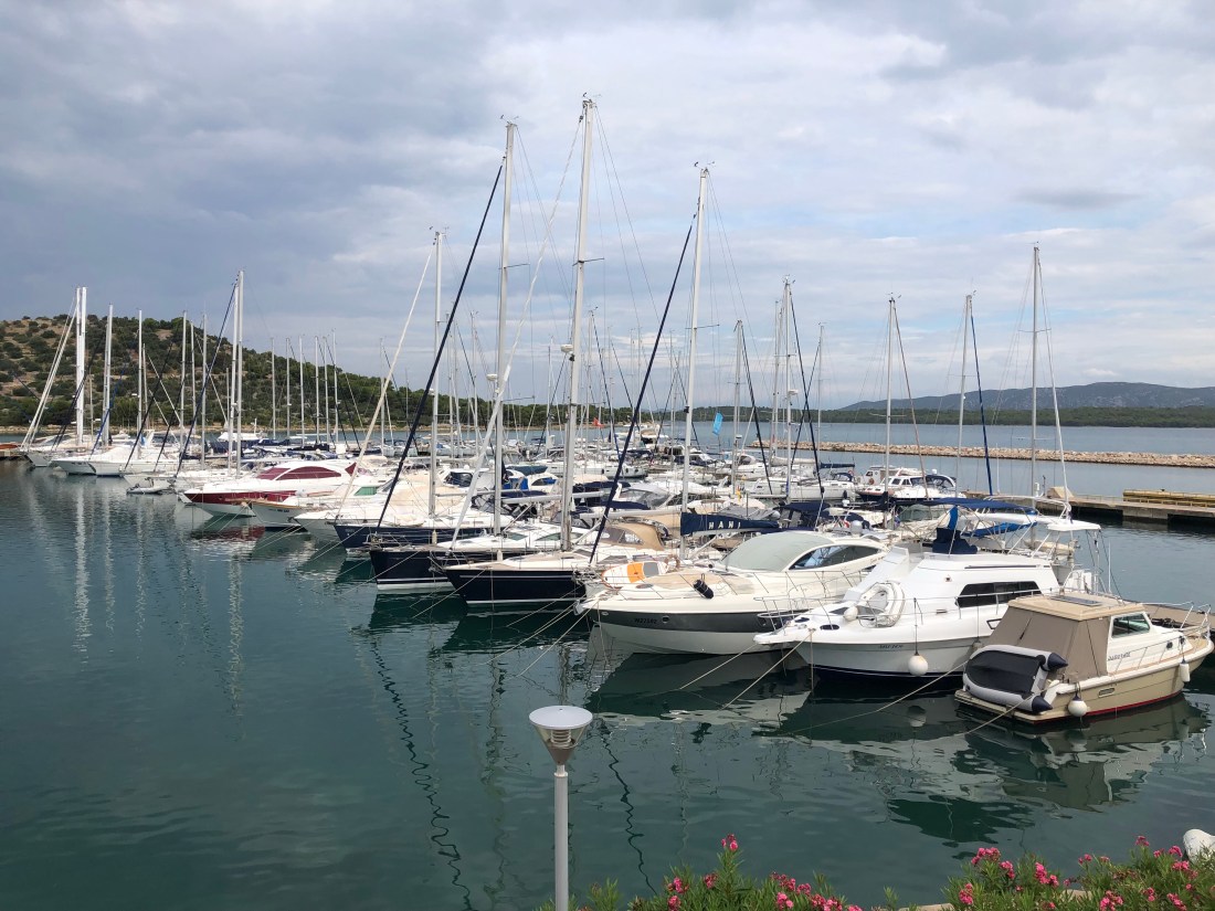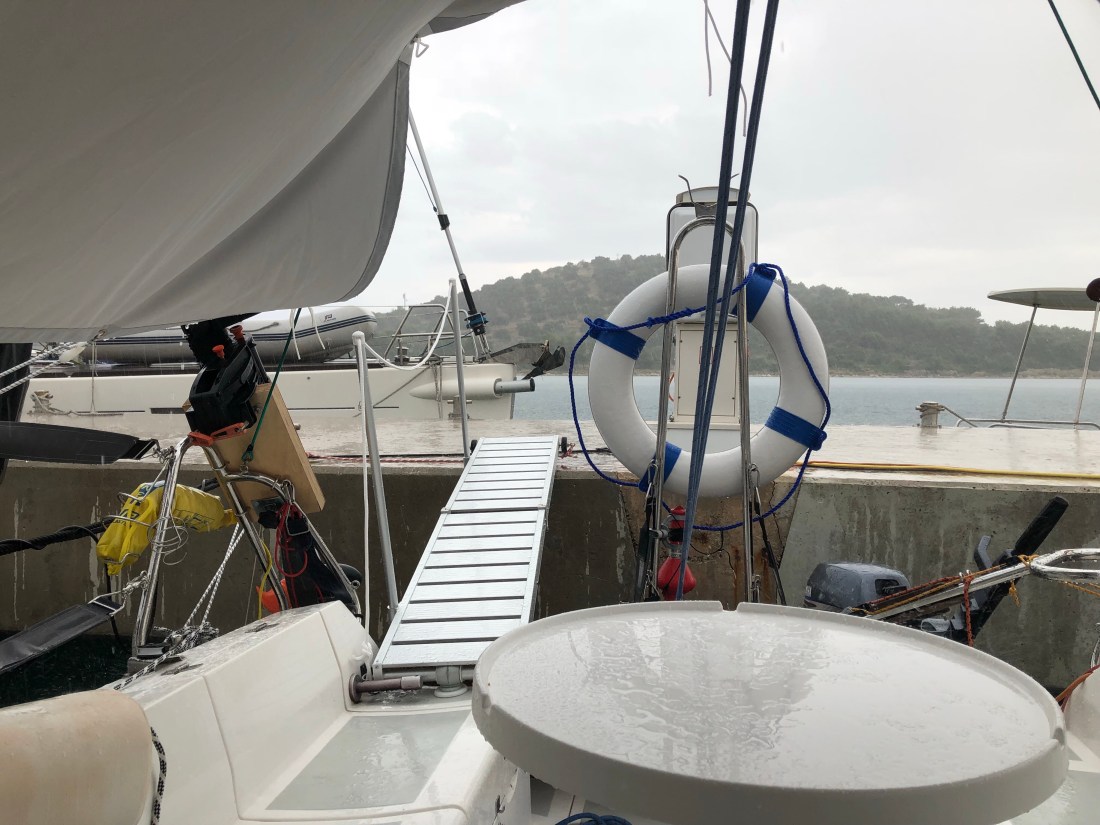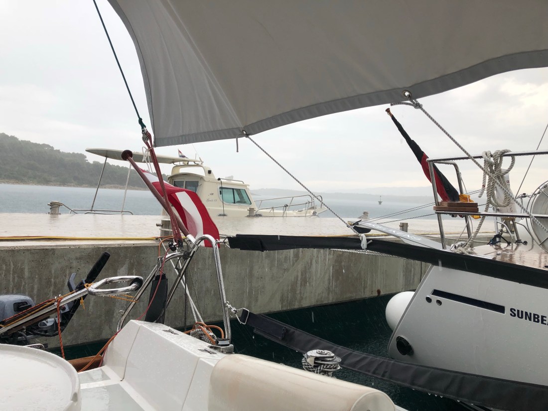 Wir erwachen mit tief dunklen Wolken, bald darauf beginnt Schüttregen auf der Insel Murter!