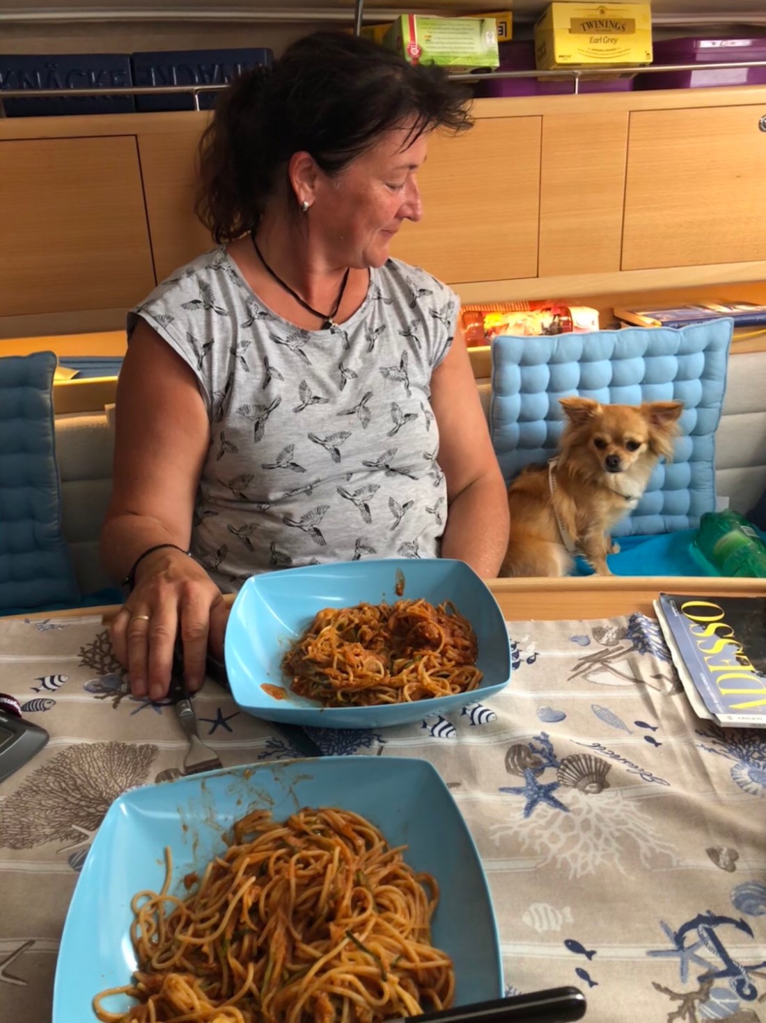 Mittags koche ich Spagetti mit Tomaten Sardellen Sauce, dabei schaukelt es schon ganz kräftig!