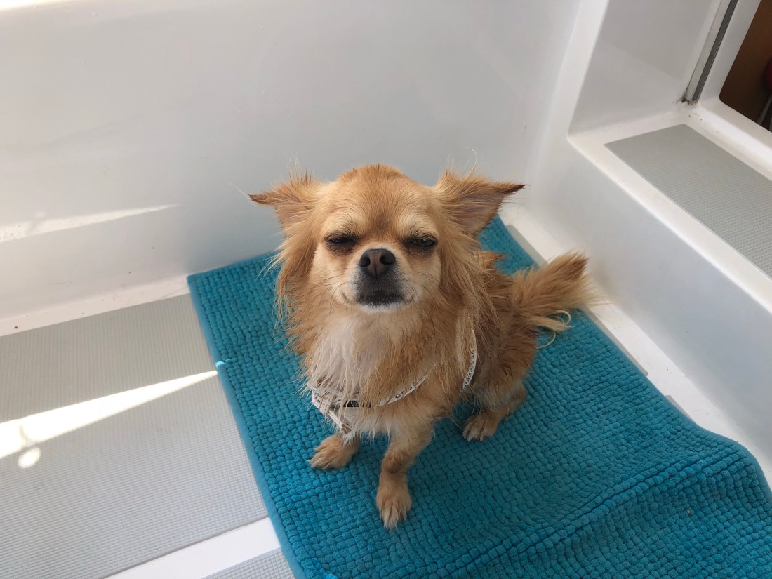 Es ist heute angenehm kühl mit frischem Wind, also studieren wir unsere Seekarten, gehen zum Konzum Wasser,… holen, frühstücken, da das Joghurt für das Müsli leer ist.