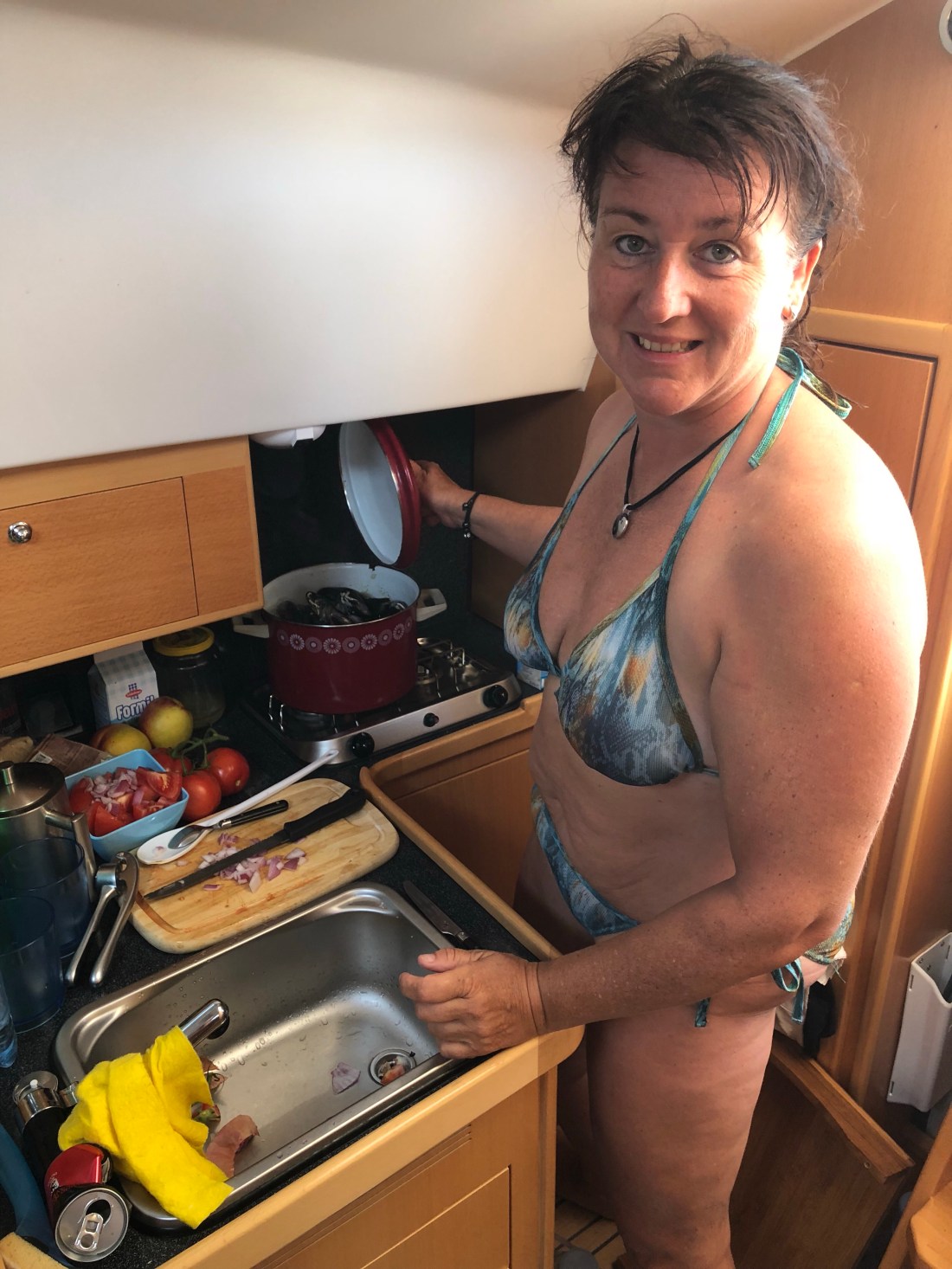 Dort putze und koche ich die Miesmuscheln die wir zuvor gekauft hatten, in Weißweinsauce mit Weißbrot und Tomatensalat!